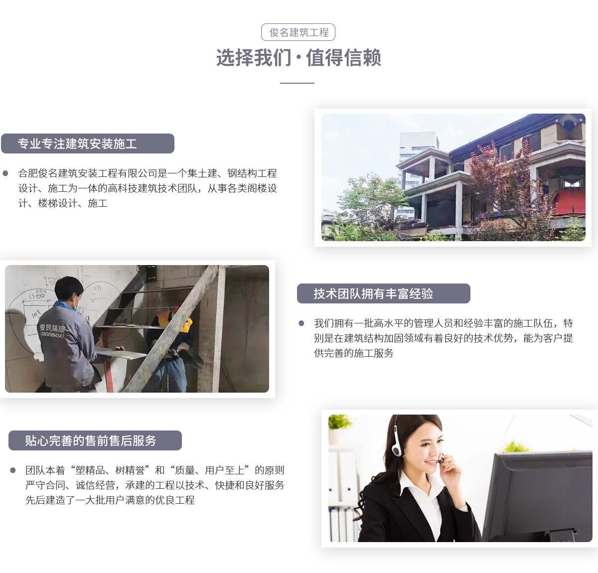 合肥俊名建筑安裝工程有限公司是一個集土建、鋼結構工程設計、施工為一體的高科技建筑技術團隊,從事各類閣樓設計、施工。我們擁有一批高水平的管理人員和經驗豐富的施工隊伍,特別是在建筑結構加固領域有著良好的技術優勢。團隊員工精誠團結,以“尊重規范,拒絕平凡”為宗旨,為客戶提供完善的施工服務。團隊本著“塑精品、樹精譽”和“質量、用戶至上”的原則,嚴守合同、誠信經營,所...